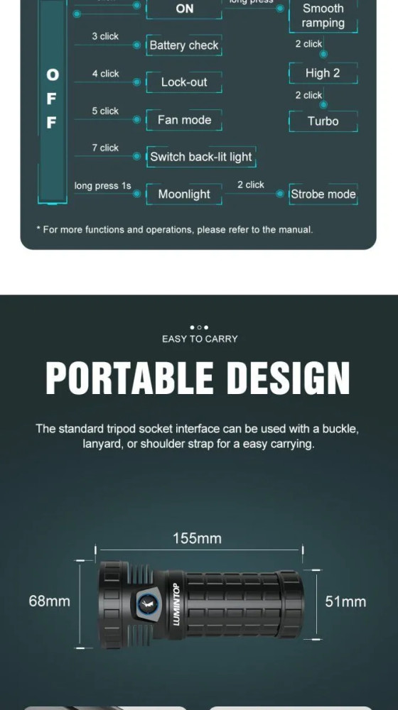 • K dispozici jsou také režimy Strobe, SOS a Beacon, kontrola baterie a funkce uzamčení