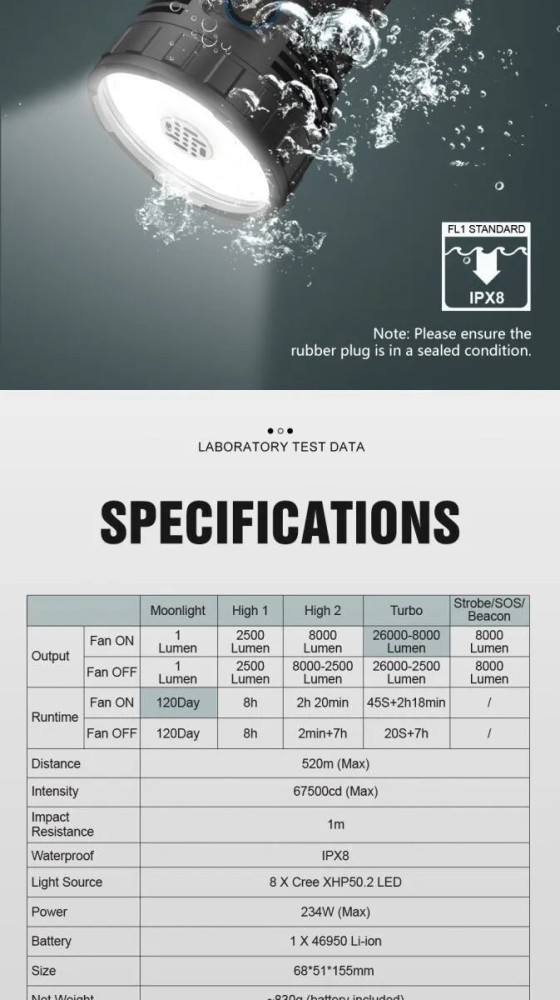 • Plynulý přechod z měsíčního svitu na vysoký, maximální výkon 26 000 lumenů a vzdálenost paprsku 520 metrů