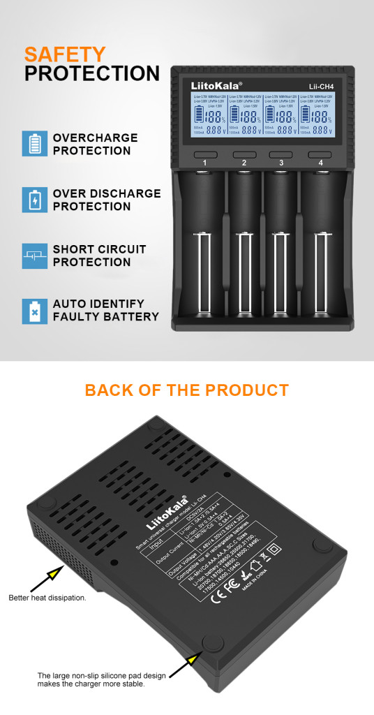 Táto nabíjačka dokáže nabíjať iba valcové lítium-iónové batérie (Li ion 3,70 V/3,80 V), lítium-železité fosfátové batérie (LiFePO4-3,20 V) a nikel-vodíkové/nikel-kadmiové batérie (Ni MH/Nicd 1,20 V); A 1,5 V lítium-iónové batérie (4,2 V až 1,5 V);