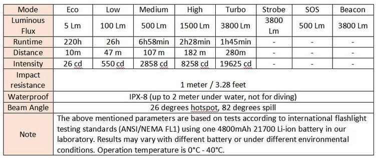 • Telo svietidla: Hliníková zliatina leteckej kvality 6061, vyrobená CNC tvrdým eloxovaním podľa vojenskej špecifikácie typu III, antiabrazívna povrchová úprava na získanie pevnej konštrukcie tela, geometrie proti nárazom a lepšej výmeny tepla.
