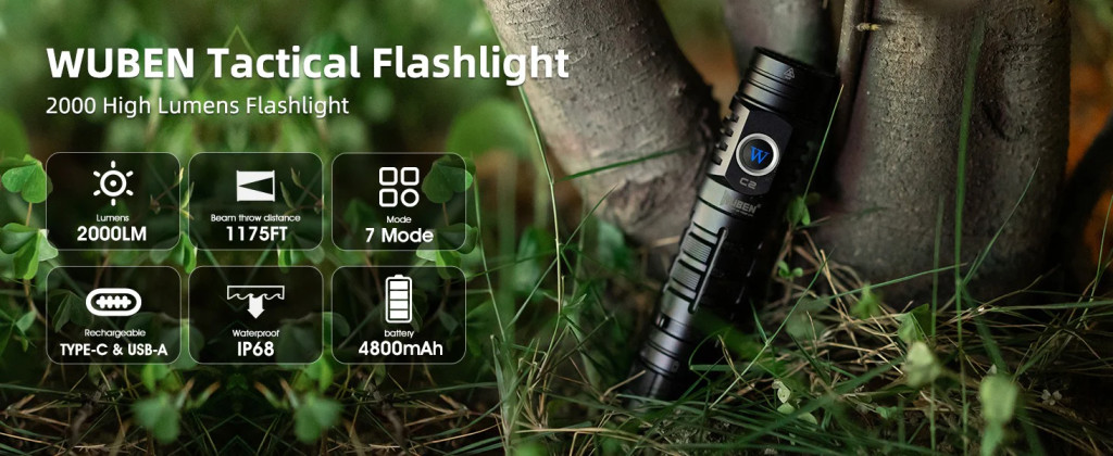 WUBEN C2 Výkonná LED baterka, 2000 lumenov, nabíjateľná, IP68 vodotesná, 7 režimov