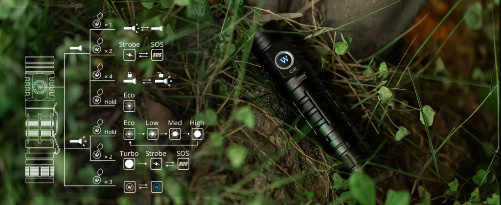 • 7 režimov + pamäť + modré dýchacie svetlo: základné režimy: vysoký, stredný, nízky, ECO (s pamäťou), skrytý Turbo (dvojklik), blikajúce režimy: Stroboskop, SOS.