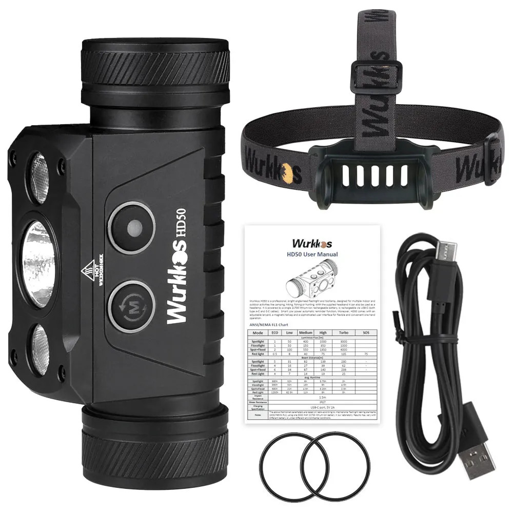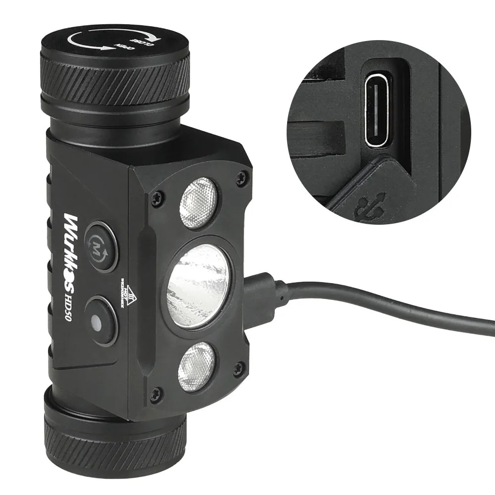 Wurkkos HD50 4000 lumenů dobíjecí čelovka USB C pravý úhel světla Výkonné světlo 21700