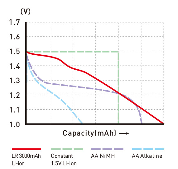 • Nová generácia vybíjacej krivky: mierne klesajúce napätie, stabilnejší výkon pre nízkoprúdové zariadenia, dlhšia výdrž než tradičné NiMH a alkalické batérie.