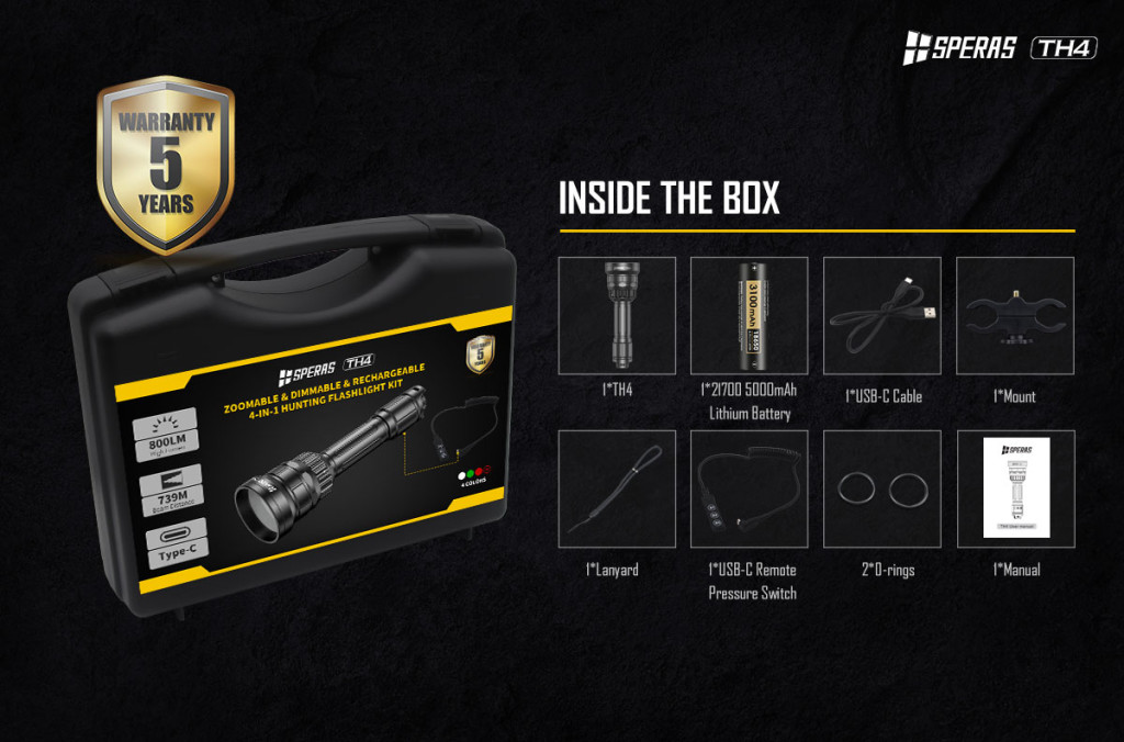 • 4-v-1 Farebné LED: Biela, Červená, Zelená, IR850 sú štandardné LED diódy v jednej baterke TH4, ktorá je profesionálnou LED baterkou pre lov. ● Diaľkový tlakový spínač USB-C: TH4 obsahuje diaľkový tlakový spínač typu C pre pohodlnú obsluhu bez rúk a podporuje nabíjanie typu C pre rýchle a efektívne doplnenie energie.