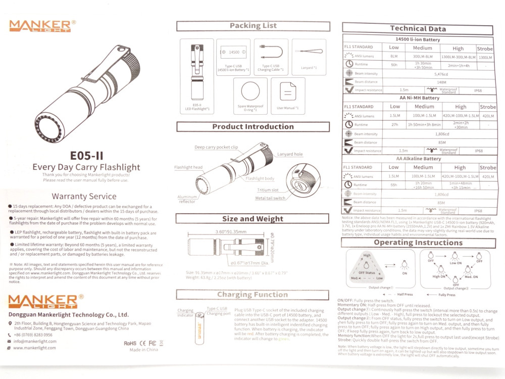 • Svítilna E05 II Ti je dodávána s jednou li-ion baterií Mankerlight o kapacitě 920 mAh a kapacitě 14500 mAh s vestavěným portem USB typu C pro nabíjení.