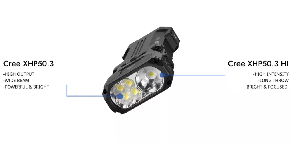 • Prepínateľný široký a diaľkový kužeľ – Vybavená CREE XHP50.3 HI LED. Jednoducho prepínajte medzi širokým osvetlením a diaľkovým lúčom pre rôzne scenáre. Všestranná nabíjateľná baterka na všetky použitia.