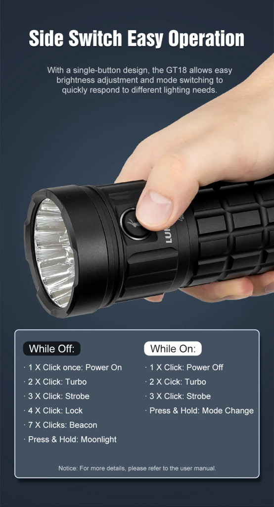 GT18 vonkajšie svietidlo s USB-C nabíjaním a výkonom 7000 lúmenov je výkonné zariadenie určené do extrémnych podmienok. Vďaka 8 vysoko výkonným LED diódam poskytuje až 7000 lúmenov svetla s dosahom 400 metrov. Napájané je lítium-iónovou batériou s kapacitou 32 000 mAh, ktorá ponúka až 60 dní výdrže v režime Mesiaca. USB-C port umožňuje rýchle nabíjanie a svietidlo zároveň funguje ako powerbanka s výkonom 22,5 W. S viacerými ochrannými funkciami a vodotesnosťou IPX8 zaručuje spoľahlivý výkon v náročnom prostredí. GT18 je ideálne pre kempovanie, turistiku a núdzové situácie – ponúka silné osvetlenie, dlhý chod a bezpečnosť.